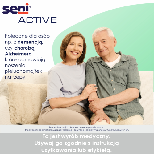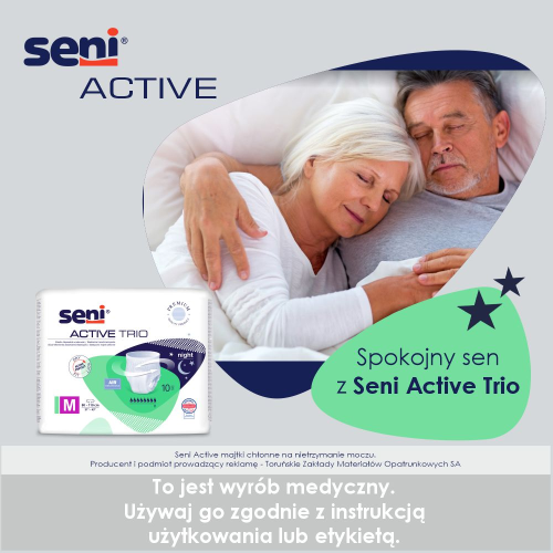 Oddychające, jednorazowe majtki chłonne Seni Active Trio dla osób z bardzo ciężkim stopniem nietrzymania moczu; rekomendowane również do użycia w nocy.