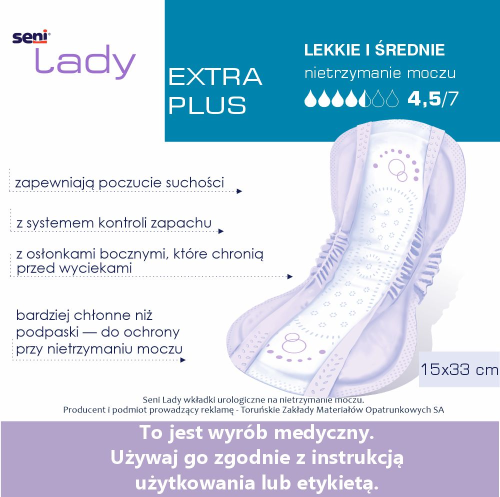 Wkładki urologiczne Seni Lady Extra Plus – dla kobiet z lekkim i średnim nietrzymaniem moczu. Wkładka Extra Plus to pierwsza z "grubszych" wkładek z linii Seni Lady, która ma także większą powierzchnię i zabezpieczy przy bardziej obfitych wyciekach moczu. Z osłonkami bocznymi i systemem rozprowadzania wilgoci (EDS) skutecznie chroni przed wyciekami.
