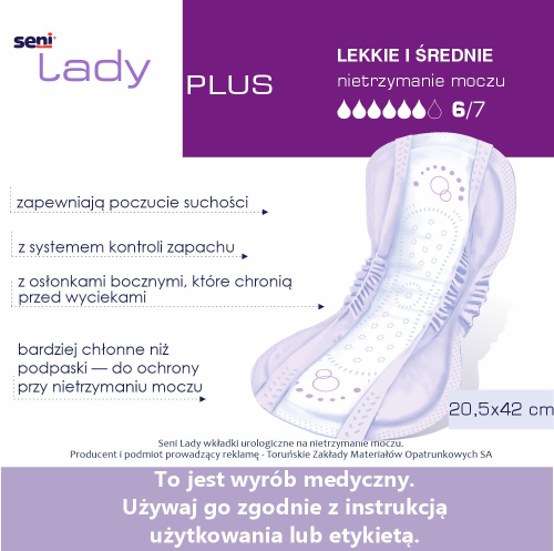 by móc czuć się komfortowo, np. w podróży. Seni Lady Plus to największa wkładka z linii Seni Lady. Z osłonkami bocznymi i systemem rozprowadzania wilgoci (EDS) skutecznie chroni przed wyciekami.