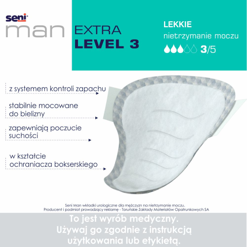 Oddychające wkładki urologiczne dla mężczyzn Seni Man Extra Level 3 zabezpieczają przy lekkim i średnim nietrzymaniu moczu.