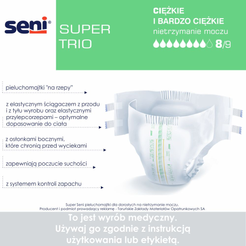 Oddychające pieluchomajtki Seni Super Trio dla osób z ciężkim i bardzo ciężkim nietrzymaniem moczu oraz inkontynencją kałową: