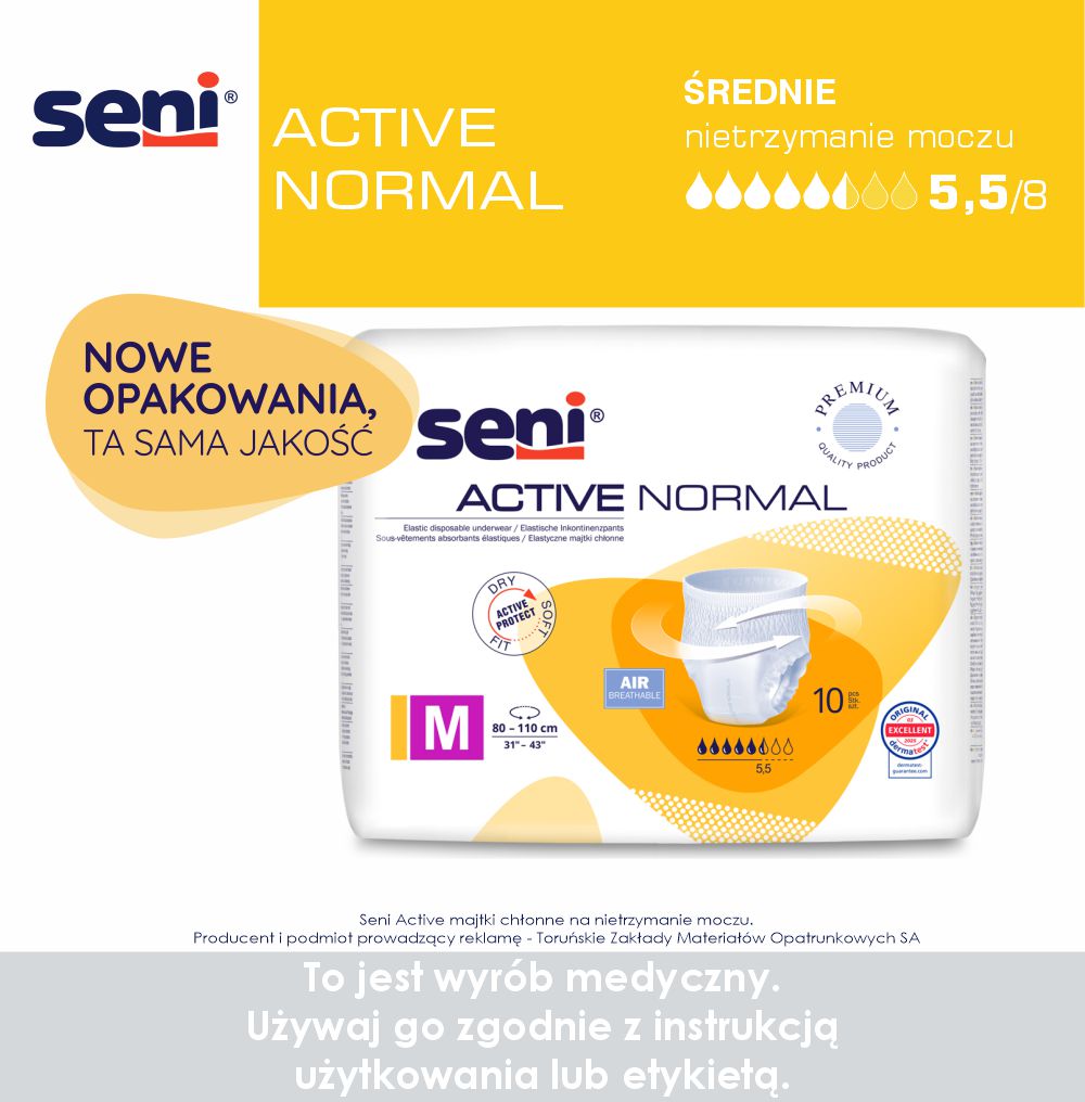 Jednorazowe majtki chłonne Seni Active Normal to praktyczne rozwiązanie dla osób prowadzących aktywny tryb życia, które cenią sobie dyskrecję i wygodę. Seni Active Normal chronią przy średnim nietrzymaniu moczu. Są elastyczne i zakłada się je jak zwykłą bieliznę. Odpowiednie także dla osób w przebiegu choroby Alzheimera lub innych form demencji, które odmawiają noszenia pieluchomajtek.