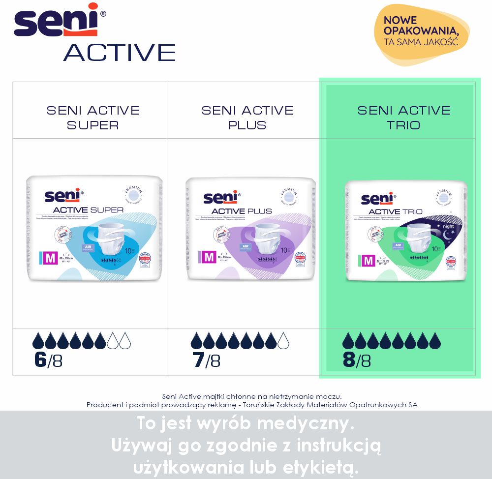 Oddychające, jednorazowe majtki chłonne Seni Active Trio dla osób z bardzo ciężkim stopniem nietrzymania moczu; rekomendowane również do użycia w nocy.